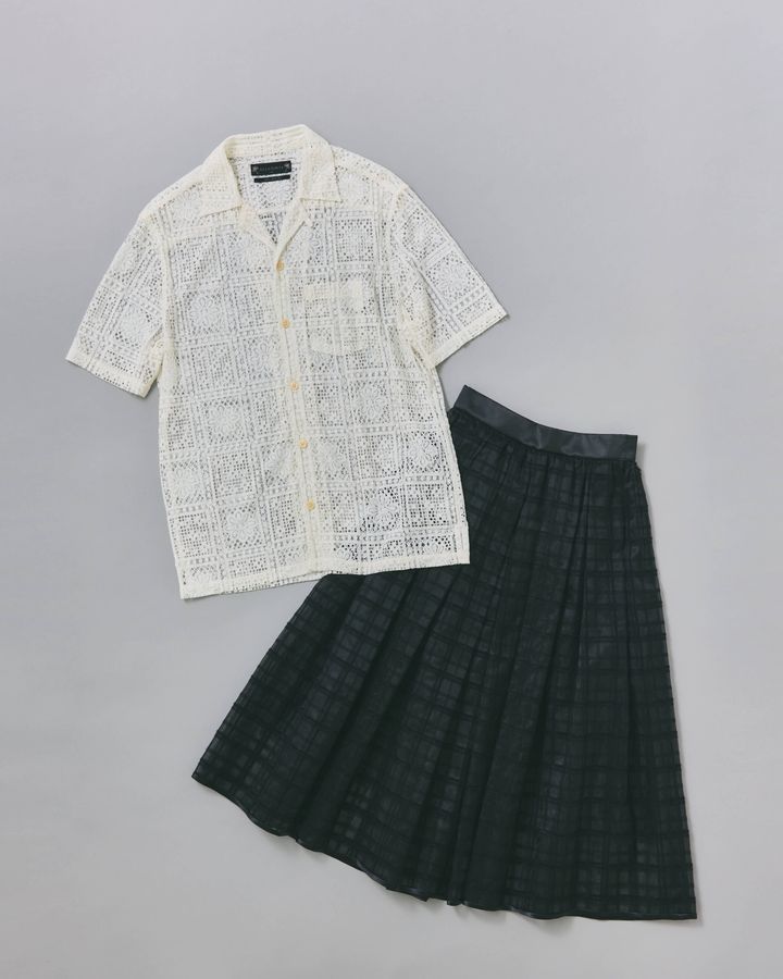 [左]透ける前提が今っぽい。太めのパンツに合わせてメンズライクに着こなしたい。シャツ[メンズ商品]¥26,400(オールセインツ/エイチスリーオーファッションビュロー)[右]柄が軽やかさをくれるから、黒でも重たい印象にならず真夏から使えます。スカート¥38,500(ソブ/フィルム)