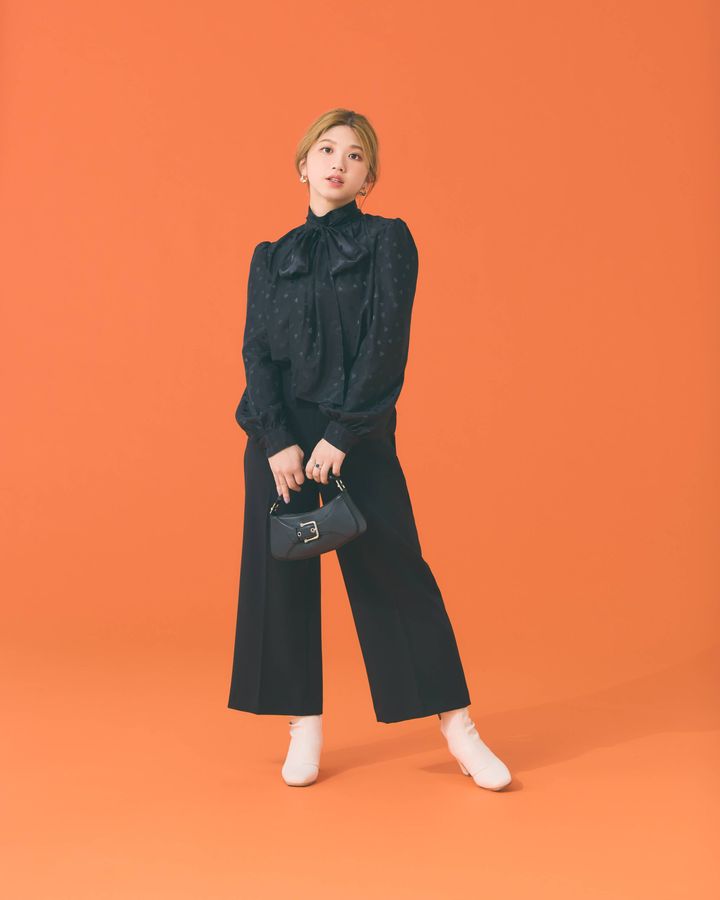 ボウタイブラウス¥37,400(ソブ/フィルム)パンツ¥8,900(アテニア)ピアス¥30,800(プリュイ/プリュイ トウキョウ)人差し指リング¥9,900(イン ムード/フォーティーン ショールーム)中指リング¥27,500(フォークバイエヌ/UT SPR)バッグ¥42,900(オソイ)ブーツ¥21,500(ダイアナ/ダイアナ 銀座本店)