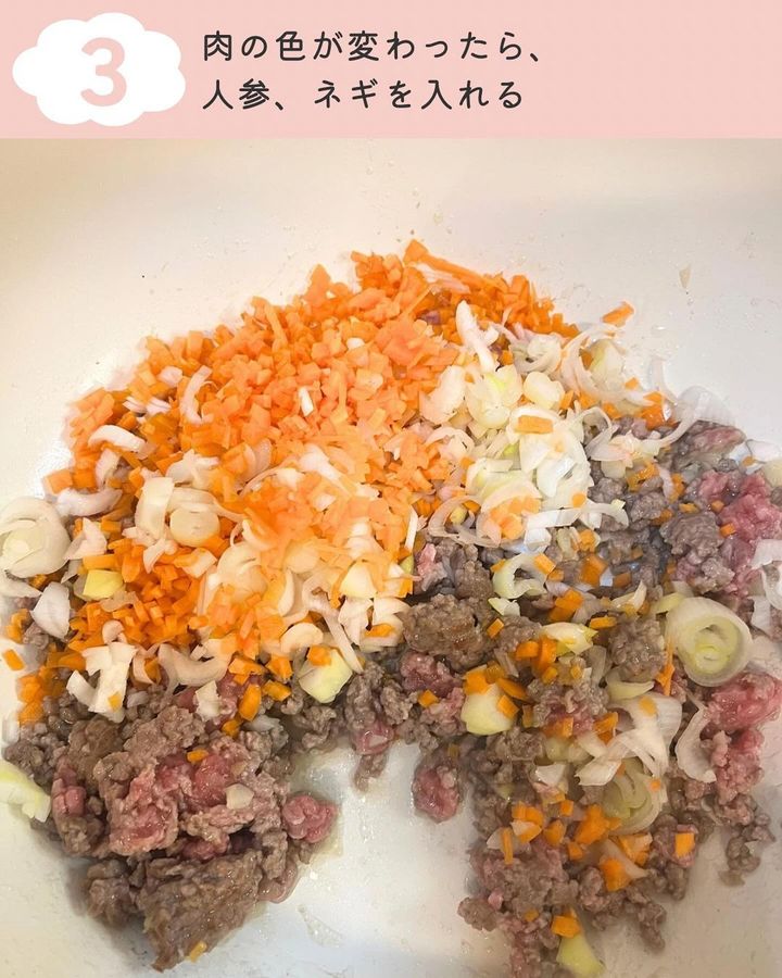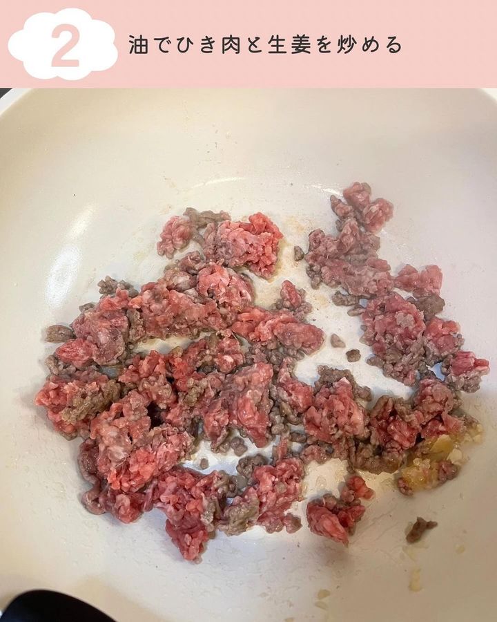 ひき肉からも脂が出るので、最初は小さじ2くらいを入れて様子を見て、焦げ付きそうな場合は足しましょう