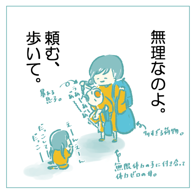 うん、これは無理ですね。娘ちゃんには申し訳ないですが、なんとか頑張って自分で歩いてもらうしかないです。この状況、ママも泣きたくなってしまいますよね(泣)