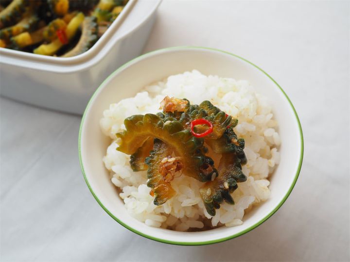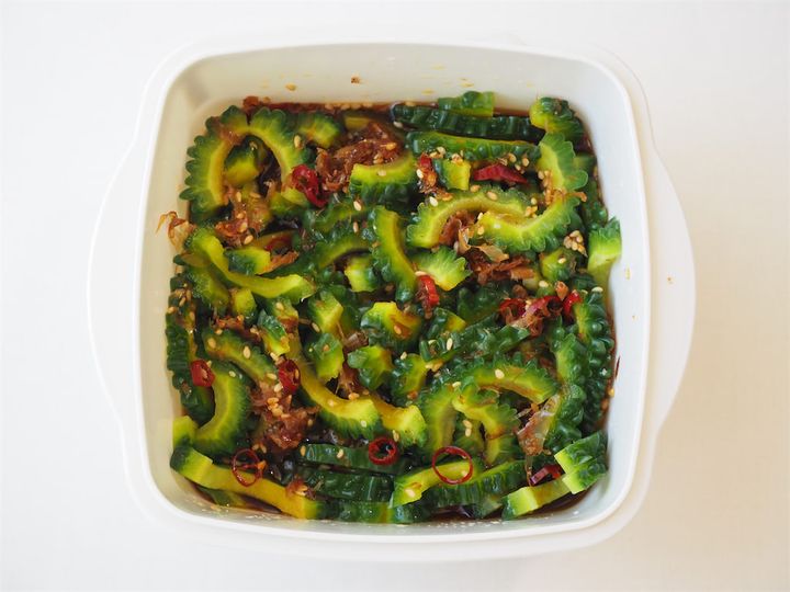 お次は1日漬け込んだもの。身が少ししなっとしていて、色も茶色く変わってタレが染み込んでいるおいしそうな様子にワクワク。食べてみると、ゴーヤの苦味と酢じょうゆのちょうど緩和されたような味わいがじゅわっと口の中に広がります。しゃきしゃきの食感も健在。香ばしい白いりゴマと唐辛子のピリ辛のアクセントが、味わいや風味をさらに豊かにしてくれています。ほかほかのご飯に乗せるとたまらないおいしさ。これはご飯泥棒!わたしは断然こっち派。おつまみにしてもよさそうです。