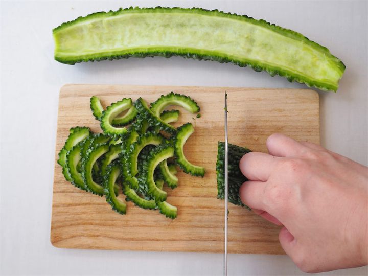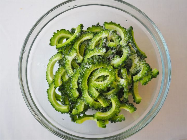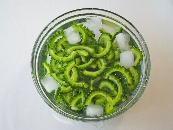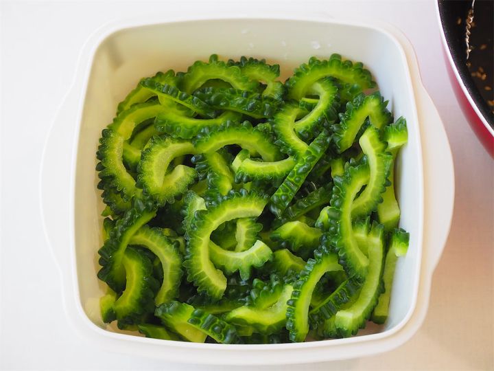 2. 1のゴーヤを5mm幅程度に薄切りにして、ボウルに入れる。