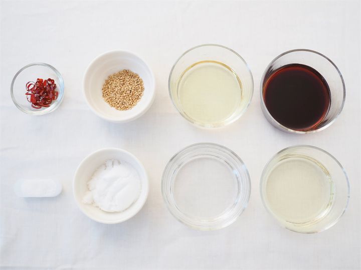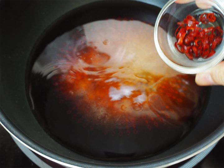 7. 鍋にしょうゆ、酒、漬けタレ用の水、砂糖、酢、鷹の爪を入れ火にかける。砂糖が焦げないように混ぜ合わせながら溶かしたら、30秒ほど沸かしてアルコールを飛ばしたら火を止める。