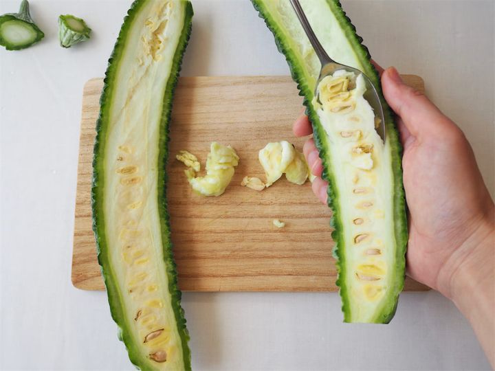 1. ゴーヤの両端を切り落とし縦半分に切り、スプーンを使って種とわたを取り除いていく。