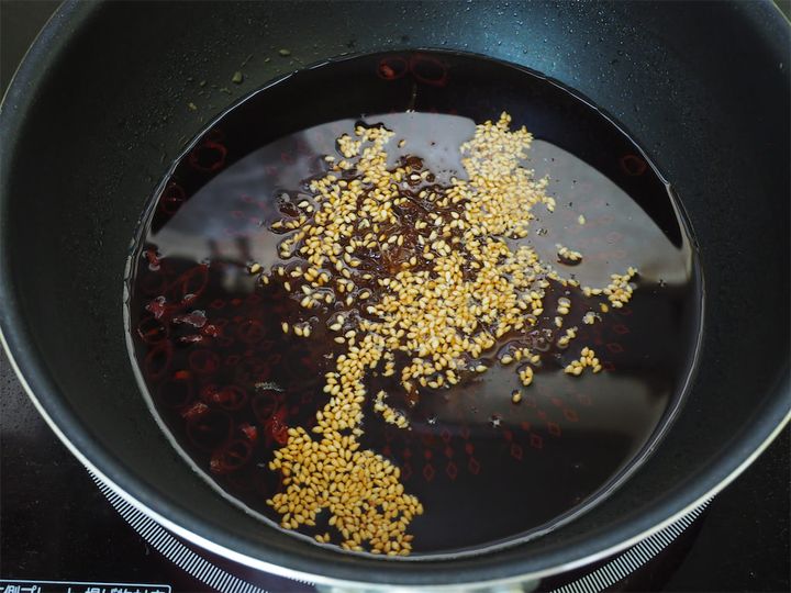 8. 7にかつお節、白いりゴマを加え混ぜ合わせたら漬けタレの完成。冷めるまで置いておきます。