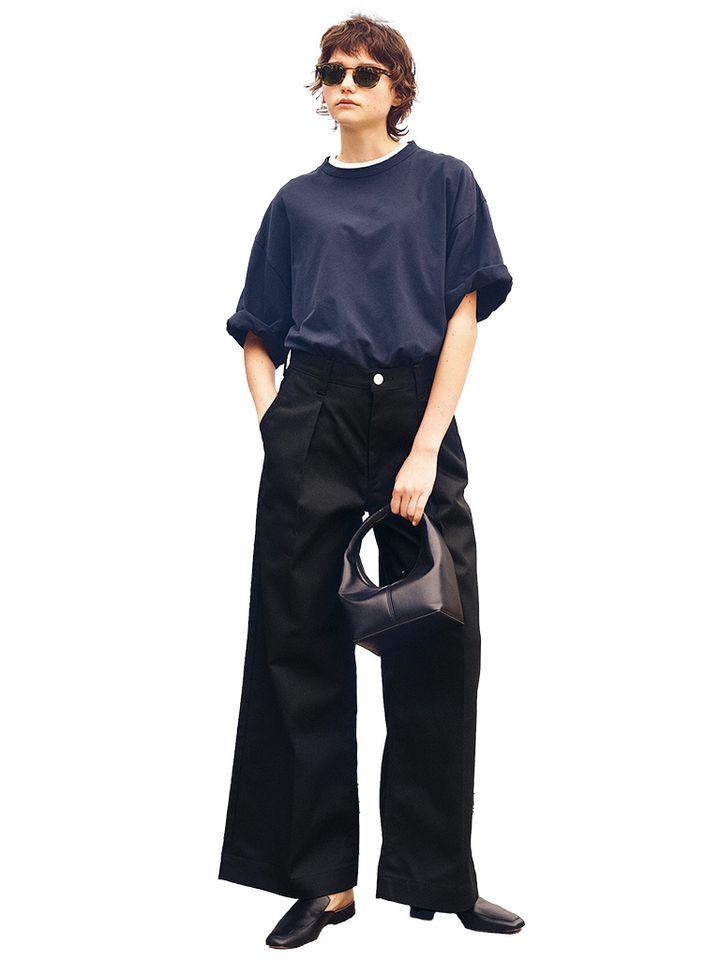 オーバーサイズのTシャツにルーズに装いたいとき。ラフさとつり合い、野暮ったさもしっかり整えてくれる。それでいてスタイルアップにも効果的な黒のワイドチノが優秀。