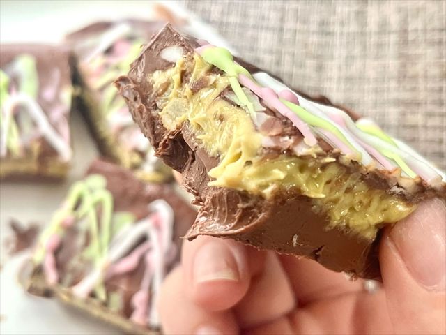 パリッとしたチョコレートの中に、ねっとりしたピスタチオスプレッド、ザクザクのそうめん。噛むたびに鳴る「ザクザク」という音がくせになります。