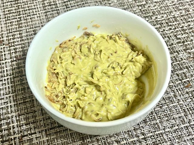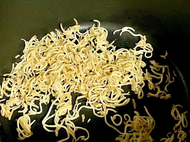 ①茹でそうめんを約1cmの長さカットし、バターと一緒に炒める。そうめんの水分を飛ばし、キツネ色に変わったらOK(弱火~中火で10分程度)。