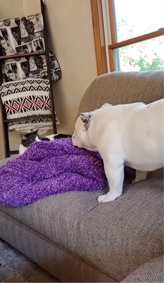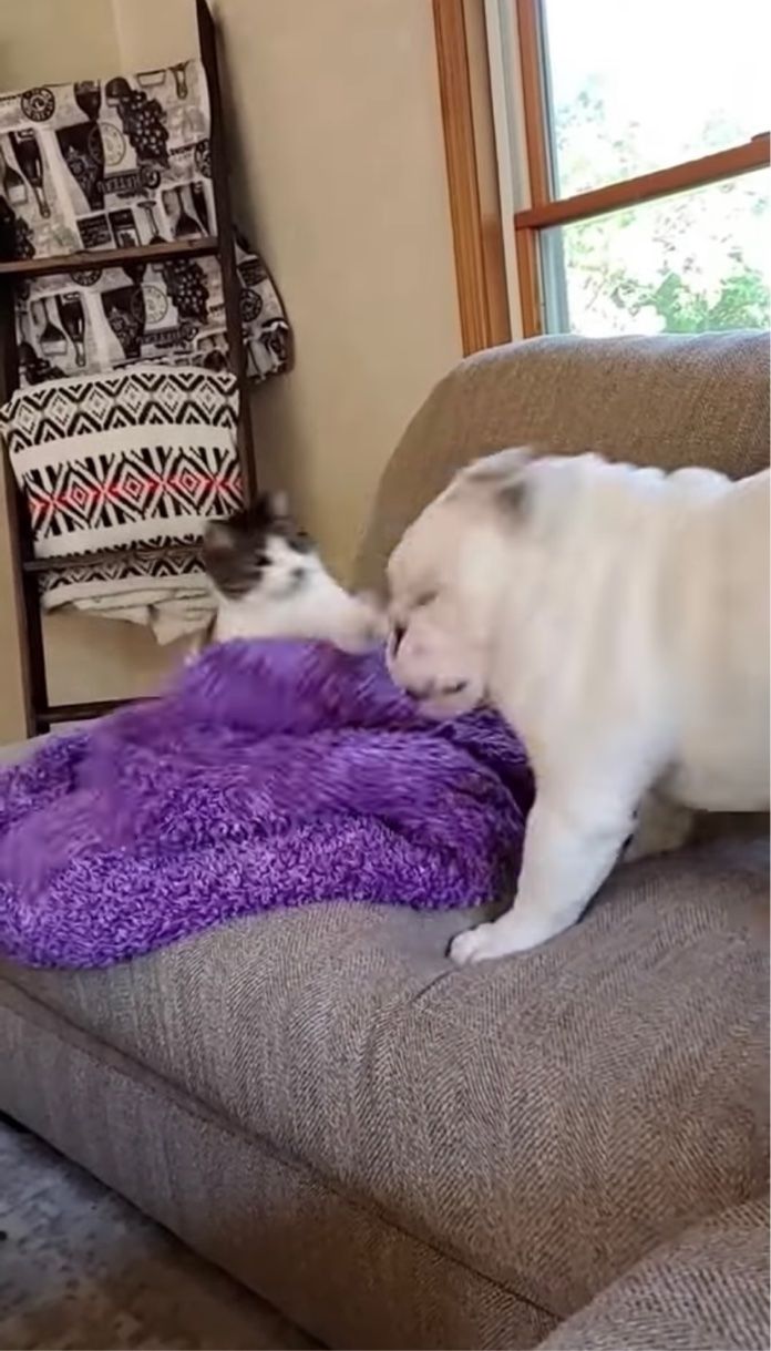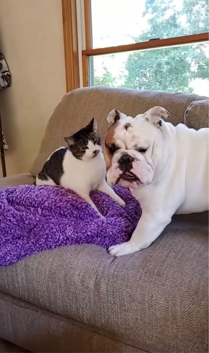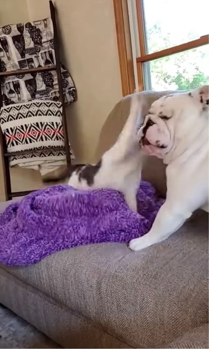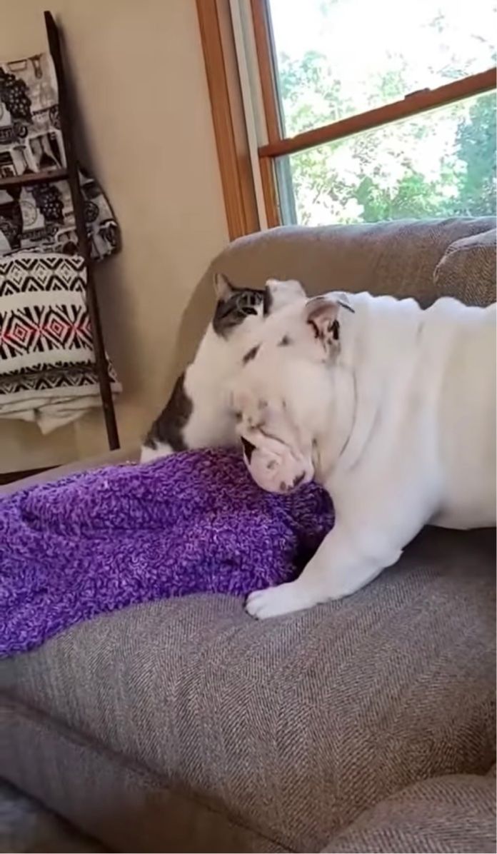 今回の動画には、同居猫の怒りを買ってしまったブルドッグの気の毒なワンシーンが捉えられていました。