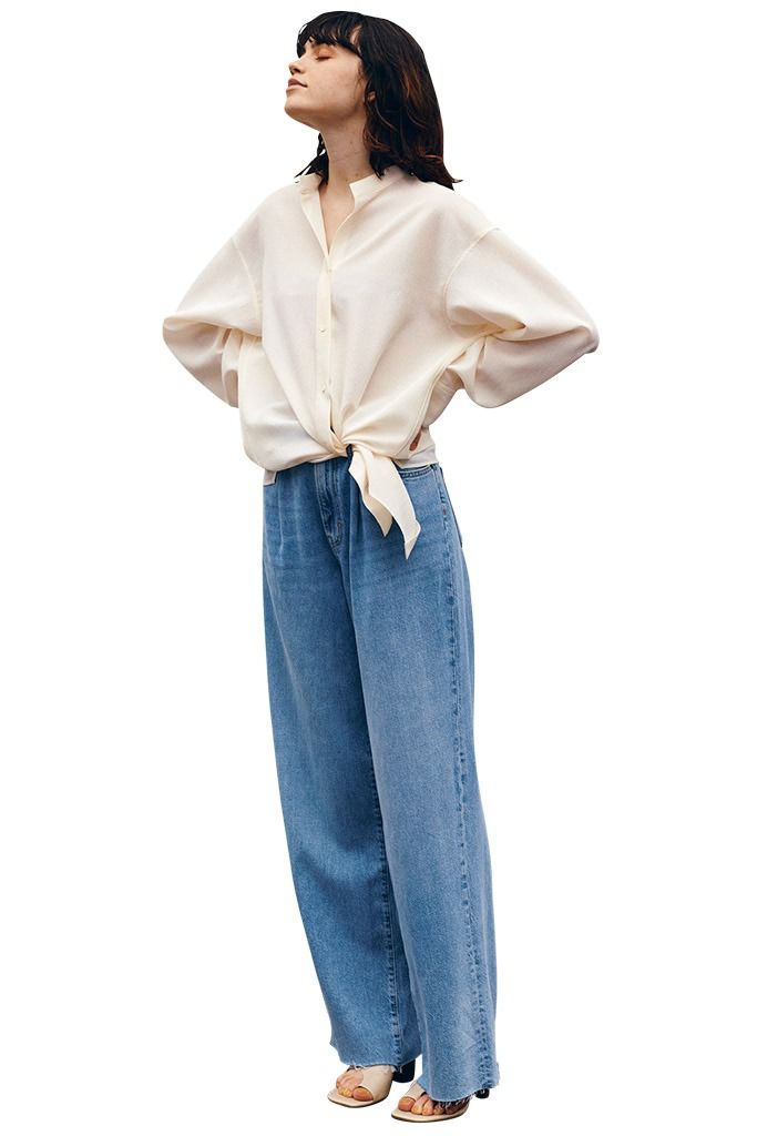 余ったすそをベルトループに通してサイドに流し、シャツに新たな動きをメイク。アレンジすることで生まれる身幅のふくらみや透明感のある素材によって、ブラウスのようなやわらかな見た目に。切りっぱなしにした無骨なデニムがむしろ生きる「甘いアレンジ」として加えたい。