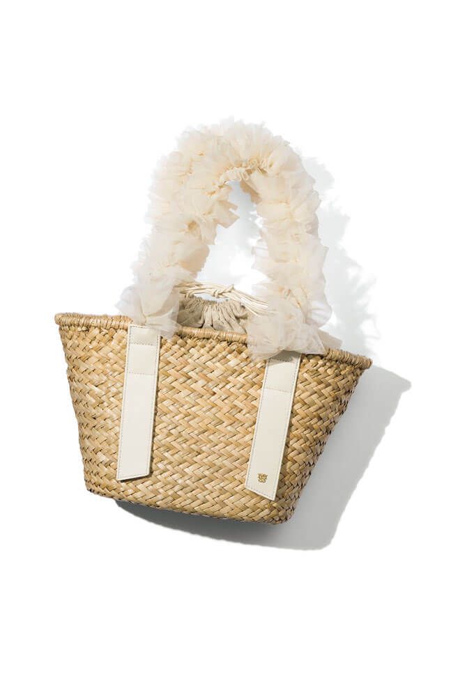 夏らしいかご素材のバッグに、チュールのあしらいでフェミニンな華やぎを。