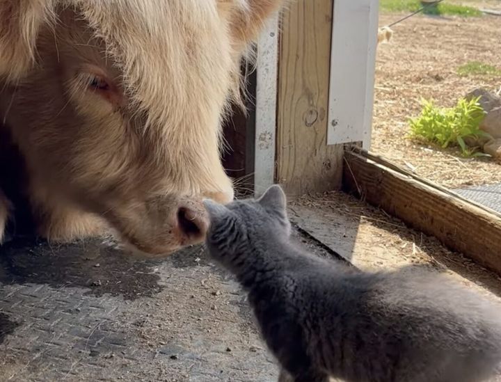 ちゃんと挨拶できるかな? 勇気を出してウシさんに近づいてみる子猫。