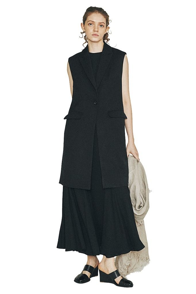 「ロングジャケットのような」ジレ。正統派なテーラードジレをシンプルにワンピと組み合わせたALL黒。ウールのような起毛感があるマットな黒を2つ重ねたことで、より黒の深みがアップ。潔いノースリーブと相まってきりっと締まった大人顔に。細めのテーラードラペルは上半身を細く見せ、フロントのワンボタンはウエスト位置を高くマーク。フロントを閉じて着てもさまになる、ロングジャケット風。