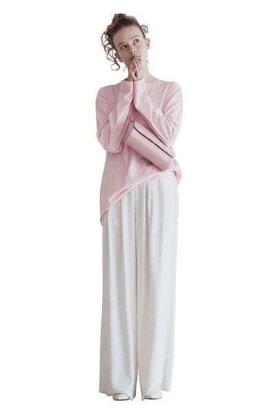 ドレッシーなサテンもパンツでなら適度にカジュアル。スカートのように優美に流れるシルエットで一見エフォートレスに見せながら、股が分かれたパンツならではのキレも加算。ルーズなシルエットの気どらなさは残しつつ、間のびを自然と回避。白×ピンクの配色も糖度ひかえめな仕上がりに。