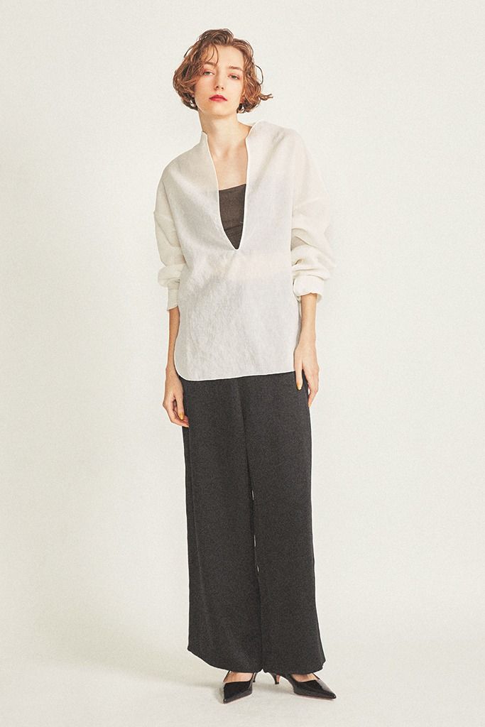 女性らしさも演出するしなやかな生地。パンツには上品な光沢を帯びる肉厚なサテン生地を使用。脚線にまとわりつかず、ゆるいシルエットのまま、まっすぐ縦に落ちる質感。おかげで幅広ボトムで気になるもたつきや太ももまわりのハリ感をカバー。ゆるっとしたプルオーバーを合わせ、モノトーンを軽快に。