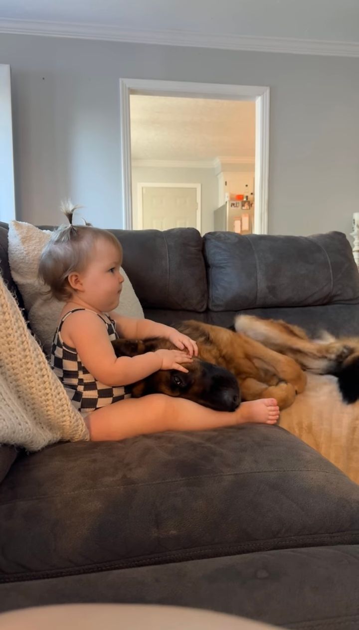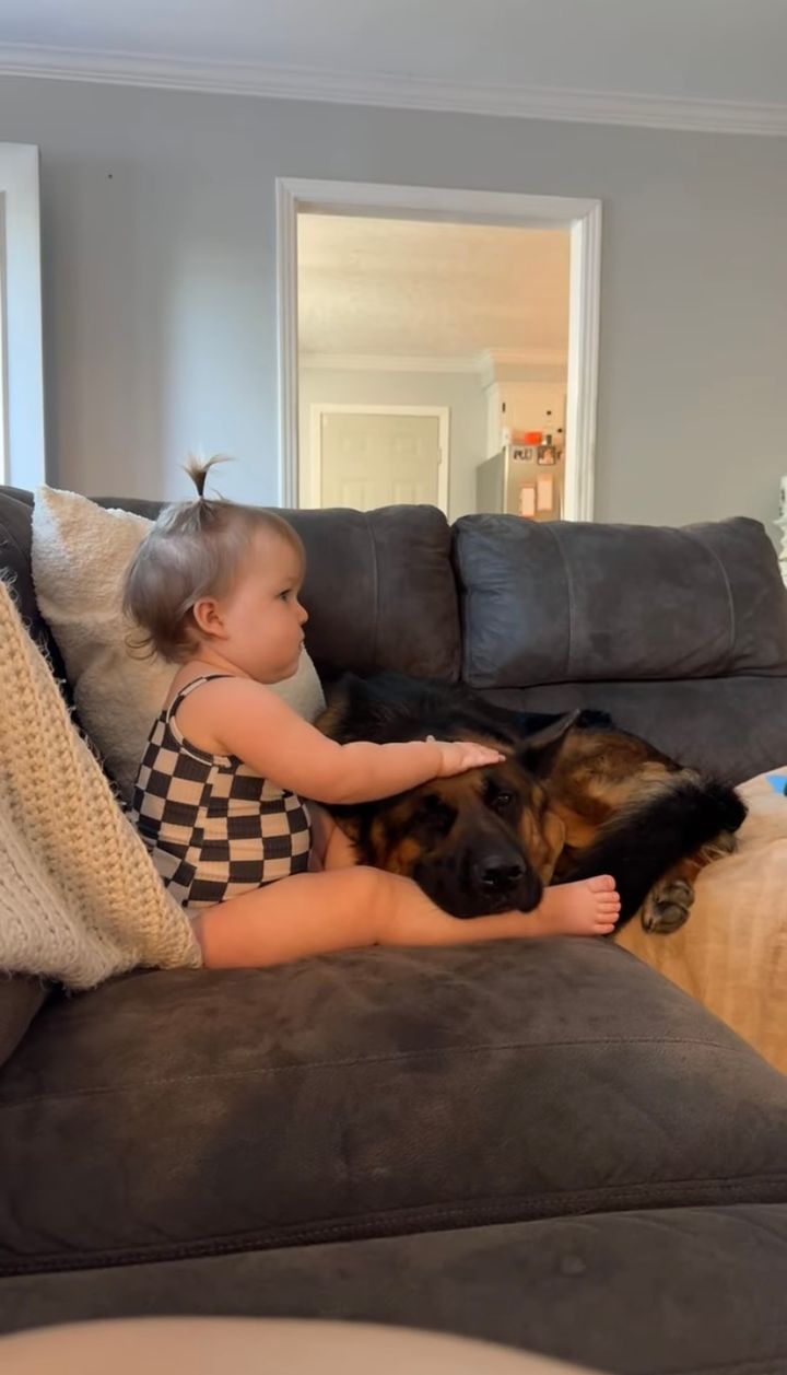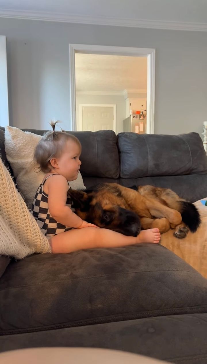 幼い女の子が映画を見ているところにやってきて、くっついているジャーマンシェパード。 大親友との至福の時間に、身も心もすっかり癒されているようです。