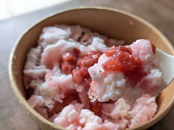 大きい!たっぷりの練乳と、いちごの果肉がインパクト大の手作りシロップが、なんとも美味しそうです。口に入れると、生のいちごのようなツブツブ感とフレッシュさが贅沢な味わいです。