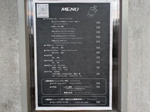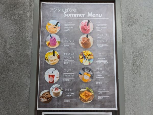バナナジュースやかき氷は、砂糖不使用だったり、甘酒の甘さを活かしていたり、甘さ控えめに作っていて、また余計な添加物などは入れずに、全てオーナーさんの手作りです。「子どもや孫が口に入れても良いと思うものを提供しています。」とオーナーの犬塚さん。 そして価格も「また来よう。」と思える価格設定にしているとのことで「アシタモばなな」なのだそうです。座れるスペースも用意していますので、溶けないうちに是非!