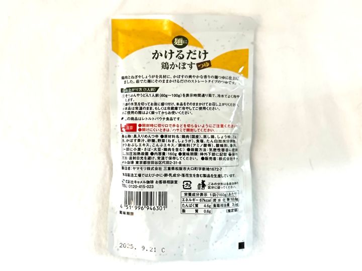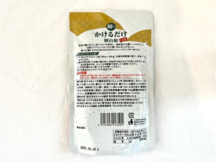 パッケージには“具材に鯛のほぐし身とくわいを使用し、風味豊かな鯛ベースのだしに山椒でアクセントをつけた麺つゆに仕上げました。茹でた麺にそのままかけて完成のストレートタイプの麺つゆです。”と記載があります。