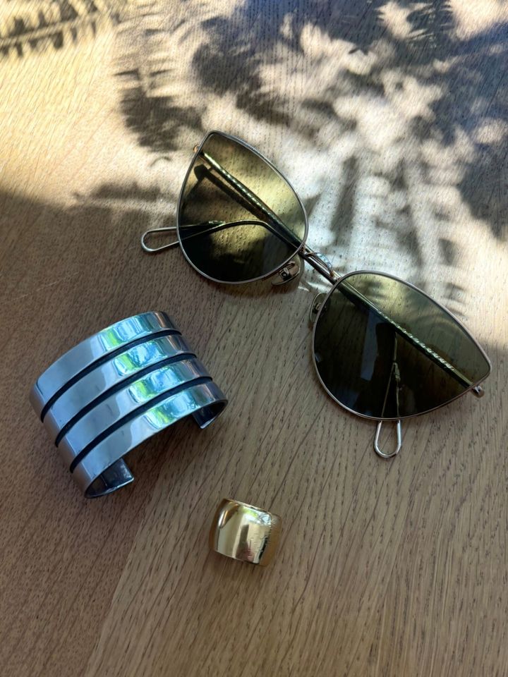 「シャープなキャットアイが特徴的なサングラス。もともとは眼鏡として購入しましたがレンズを入れ替えてこの夏はサングラスとして愛用中。ソフィーブハイのバングルとリングは、シンプルだけど存在感のあるモダンなデザインが気に入っています」AHLEMのサングラス、SOPHIE BUHAIのバングルとリングは本人私物
