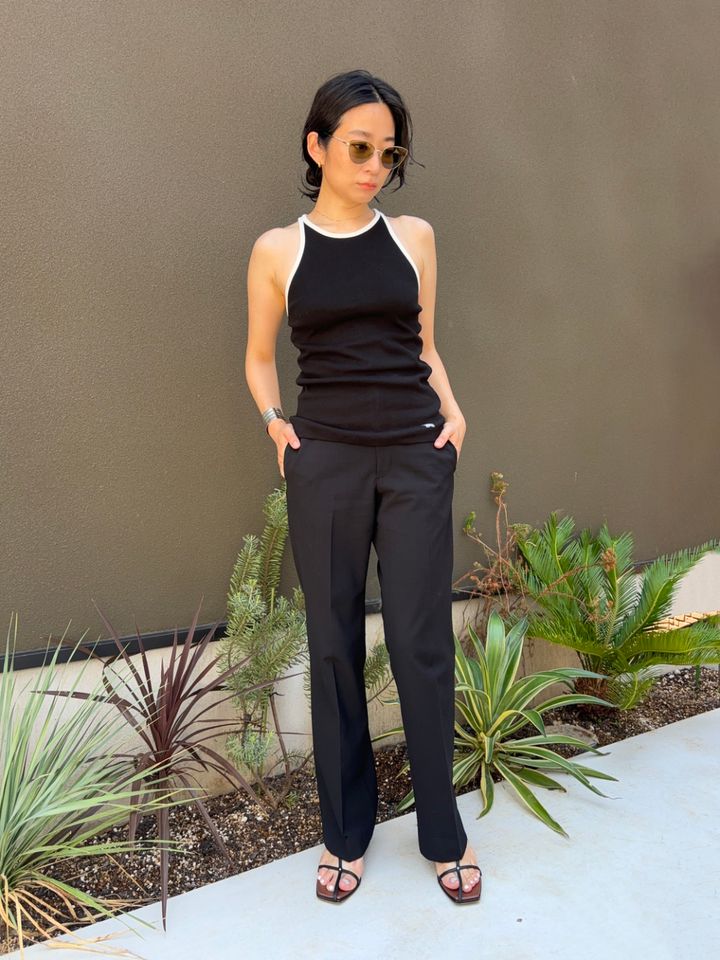 「とにかく暑いので、最近はタンクトップが制服になっています。この夏に買ったインクのタンクトップは水着のようなカッティングがお気に入り。毎日オールブラック×タンクトップと洋服がシンプルになる分、サングラスやジュエリーはちょっとだけエッジのきいた個性のあるものを選ぶようにしています」