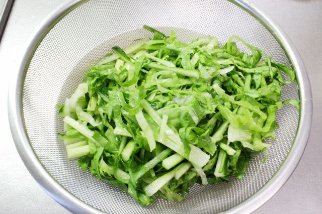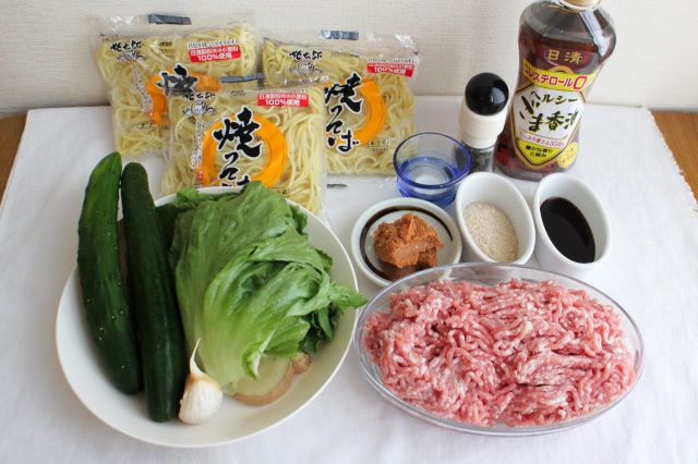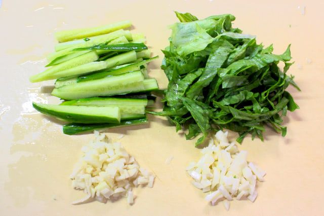 1. きゅうりとレタスを食べやすい長さの細切りに、にんにくとしょうがをみじん切りにします。