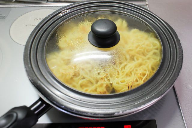 両面を焼いて麺に焼き色は付いたものの、麺同士がくっついてほぐれにくそう。そこで、水を大さじ2(分量外)ほど加えてフタをし、1分ほど蒸しました。