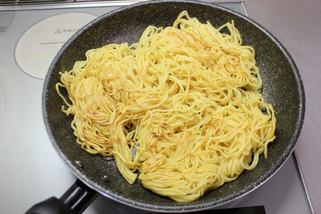 6. 別のフライパンに焼きそばを広げて中火にかけ、両面に焼き色を付けます。