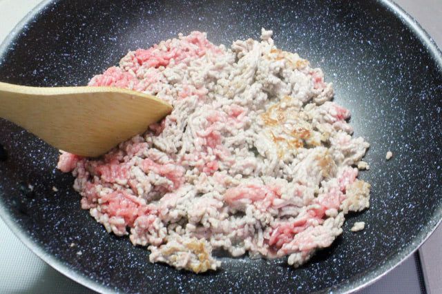 3. フライパンにゴマ油を引いて強めの中火で熱します。固まりのまま豚ひき肉を入れて、塩と黒こしょうを振り、焼き色が付いたらひっくり返し、ほぐすように炒めます。