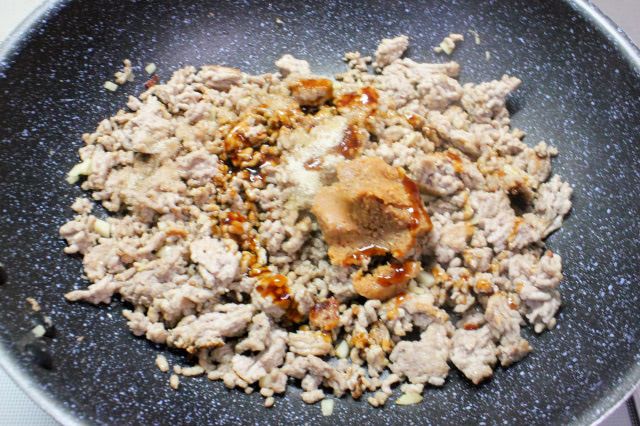 にんにくとしょうがを2分ほど炒めてから、調味料を加えました。オイスターソース、みそ、砂糖には水分がほとんどないので、豚ひき肉から出た脂でみそを溶かすようなイメージで、2分ほど炒めて調味料をなじませました。
