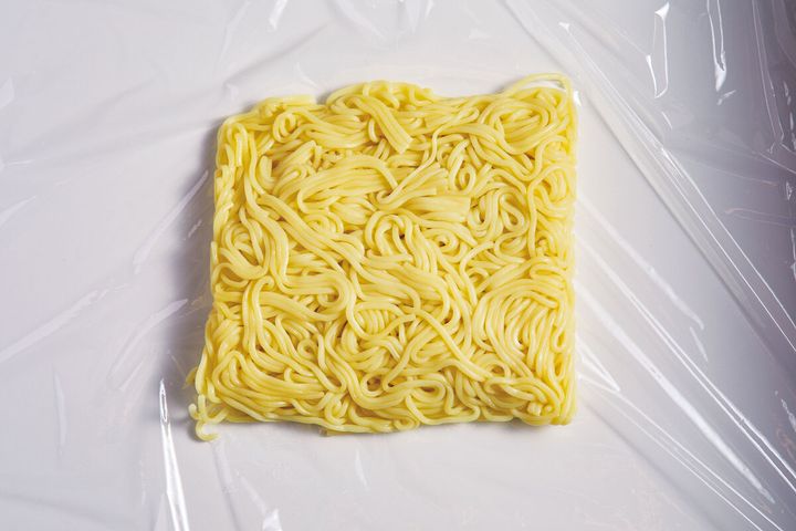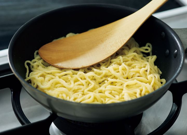 (2)直径約20cmのフライパンにサラダ油大さじ1をひき、麺を入れて平らにならす。中火にかけ、木べらで押しつけながら焼き目がつくまで2~3分焼く。