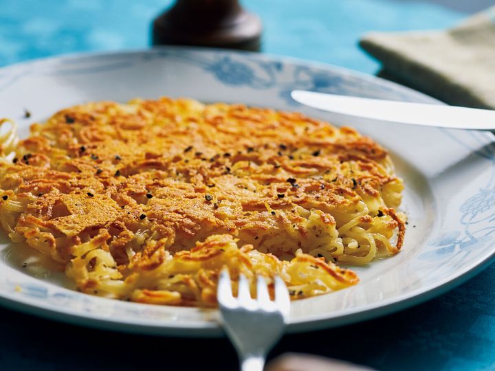 (3)粉チーズ大さじ2を上面全体にふり入れる。フライパンよりもひとまわり大きい平皿に麺をスライドさせて移し、皿にフライパンをかぶせてひっくり返す。ふたをせずに焼き目がつくまで2~3分焼き、器に盛って、塩、粗びき黒こしょう各少々をふる。
