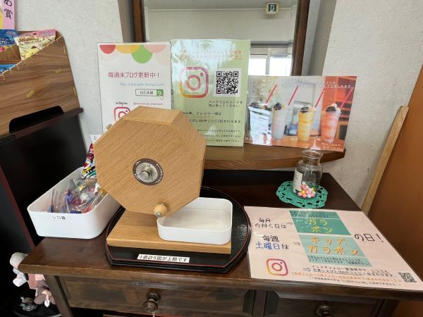 昨年12月にスタートされたという「ガラポンの日」。毎月5が付く日にお買い上げ2000円ごとに1回まわすことができるます。そして土曜日は「キッズガラポンの日」。金額条件なしで、小学生以下のお子様は一人に付き1回まわすことができます!息子たち回したがりやなので、ありがたい~。