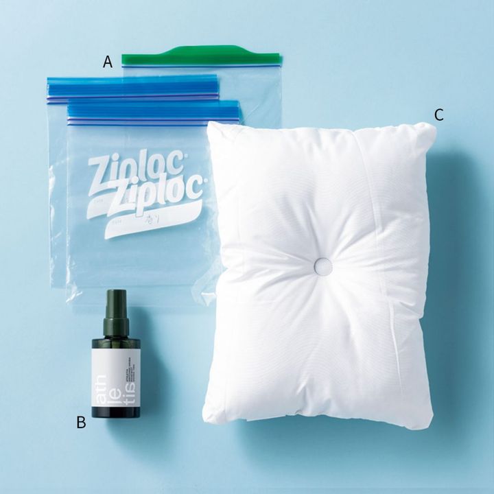 (A)液漏れが心配なコスメは、ポーチを使わずに定番のジップロックにすべて収納。(B)ホテルの香りが苦手だったり、逆に無臭で落ち着かなかったりするので、アロマミストはマストアイテム。ATHLETIAのスイッチングアロマルームミストを愛用中。ひと吹きで休らぎの空間に。(C)枕の高さが合わないと寝つきが悪くなるので、ニトリの子供用の枕を携帯。ホテルでもできるだけ普段と同じように過ごせることを意識しています。
