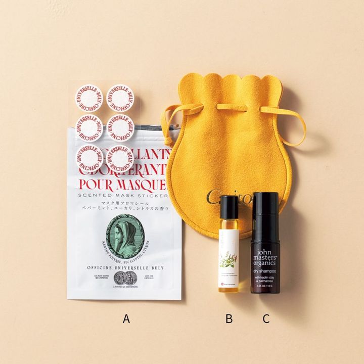 (A)OFFICINE UNIVERSELLE BULYのマスク用アロマシールは、長時間フライトwithコロナの最強の相棒。貼るだけで悪臭とは無縁の爽やかな香りが広がります。(B)頭痛やダルさに効くnahrinのハーブオイル33+7で体の不調を整えます。持ち運びに便利なロールオンタイプがオススメ。(C)髪のベタつきには、john masters organicsのドライシャンプーが大活躍。ペタンコになった髪が生き返る救世主です。(紹介者 青山 絵子さん)