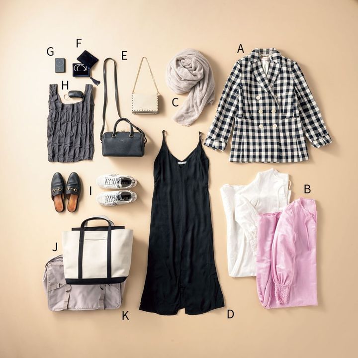 (A)ジャケットはシワになりにくい素材を選ぶと◎。(B)パジャマはリラックスできるPriv. Spoons Clubのシルクワンピを持参(C)Betto Giuseppeのカシミアストールは温度調節自在で旅に必ず持って行くものの一つ。(D)旅行時は嵩張らず着回しが効くキャミワンピを数枚用意。(E)どんなシーンにも使えるVALENTINOのミニショルダーと収納力抜群のSaint Laurentのベイビーダッフルが旅の二大相棒バッグ。(F)ジュエリーはSophie Bille Bracheのケースに収納。(G)Anker Magsafeモバイルバッテリーはコード不要で持ち歩きに便利。(H)意外と荷物になるエコバックはSOLEIL COPAINのチャームでコンパクトに。(I)シューズはシーン別にスニーカーとローファーを使い分け。(J)機内持ち込み用に軽くて大容量のZattu KINAXのバッグを愛用。(K)Surblueの吊り下げ収納ポーチはホテル到着後にそのままクローゼットにかけられる優れもの。(紹介者 SAKIEさん)