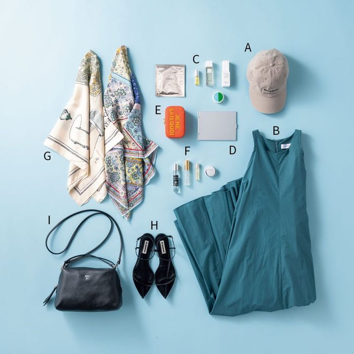 (A)キャップはコーディネートの印象に変化をつけられる万能アイテム。(B)ワンピースはあえて鮮やかな色をチョイス。バカンスにもぴったり。(C)スキンケアはあえて普段使わないものに挑戦。持ち運びに便利なミニサイズや気になっていたアイテムのトライアルセットを持参。ホテルは乾燥しやすいから保湿ケアは多めに。(D)メイクをする時、部屋によってやりづらいことがあるので鏡があると重宝します。(E)旅先でもアクセサリーを気分によって変えたいからジュエリーケースはマスト。(F)長時間フライトや旅の疲れを癒せるよう、香りのリフレッシュグッズを複数用意。(G)スカーフは嵩張らないのにコーディネートの幅を広げられるのでおすすめ。温度調節にも◎(H)足元はJIL SANDERのレザーフラットサンダルをチョイス。どんな服装にも馴染む万能アイテム。(I)旅の愛用バッグはジャンニ キアリーニのアリファ。軽くて収納力抜群。(紹介者 佐藤 匠さん)