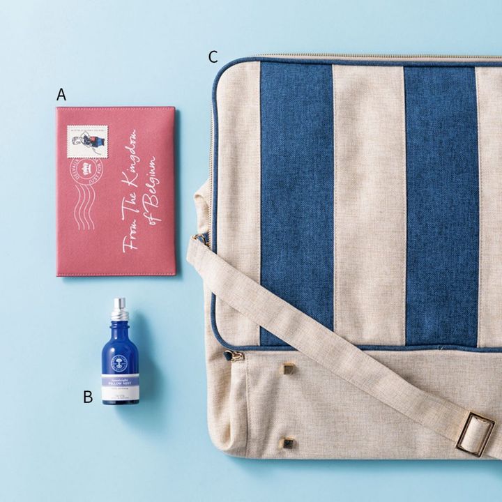 (A)DELVAUXのレターケースをパスポートケース代わりにして愛用中。旅の必需品は、お気に入りのデザインやブランドのものにまとめておくと気分が上がります。(B)ベッドリネンの香りが気になる時のために、NEAL’S YARDのピロースプレーを用意。自分のお気に入りの香りを漂わせてリラックス。(C)買い物のしすぎでお土産などの荷物が増えた時のために折りたたみ可能なトラベルバッグをスーツケースに常備。(紹介者 金 セアルさん)