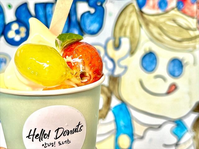韓国で話題になり、日本でも人気の「タンフル」をアイスにトッピングした「タンフルソフト」。「Hello! Donuts」で購入することができます。ミルキーで濃厚なソフトクリームと、パリッとジューシーなタンフルの組み合わせが最高なスイーツです。テイクアウト、イートインともに可能なのもうれしいポイント。