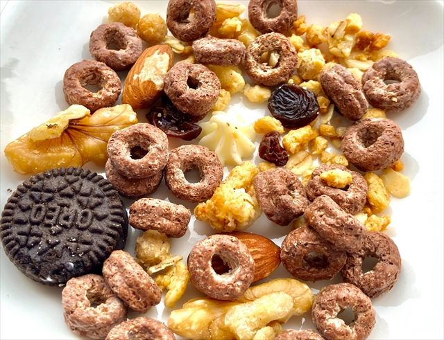 トッピングは、チョコレートやナッツ、クッキー、シリアルとたくさん入っています。普通のビヨットよりも、一つ一つが大きく、よりザクザクとした食感を楽しむことができるのもポイントの一つ。