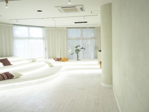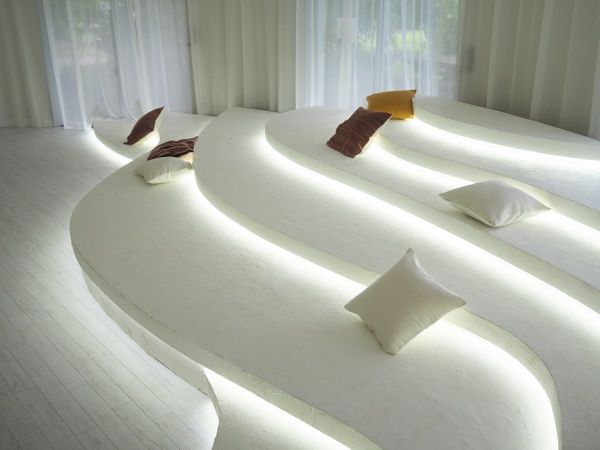 白い空間がとってもオシャレ!!腰掛けることもできる階段はライトアップされていてとても幻想的です。こちらは素足で歩いても気持ちいいように自然素材の漆喰が使われています。