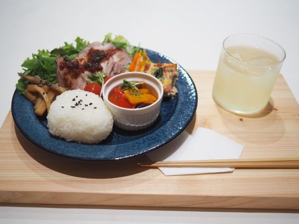 とばせプレート1200円をいただいてみました。フードメニューにプラス300円でドリンク(ラテは対象外)、プラス200円でミニアイスが付けられます。写真のドリンクは緑茶です。