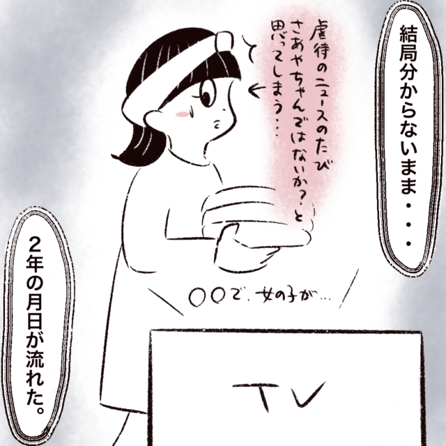 結局、さあやちゃんがその後どうなったのかわからないまま2年の月日が流れました。さあやちゃんのことがずっと気がかりだったまるさんは、テレビのニュースで子どもの虐待などのニュースを見るたびにさあやちゃんなのではないかと思ってしまうのでした。