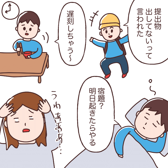 「遅刻しちゃうよ~」わかっているならば朝ご飯を食べるのを止めたらどうだろうか。挙句の果てには「宿題?明日起きたらやる」大物ぶってますけど、朝早く起きたことないよね??と毎日毎日驚くことばかり。悩みばかりが増えていきました。