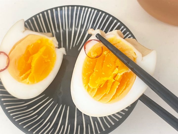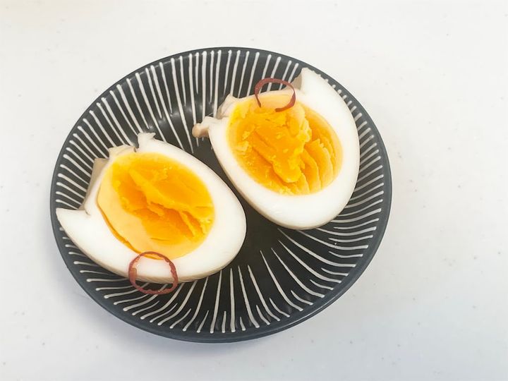 卵の殻が上手に剥けなかったので出来上がりがちょっと残念ではありますが、漬け汁が染み込んでいておいしそう。