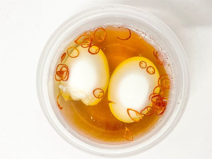 ゆで卵を入れて冷蔵庫で12時間漬けます。