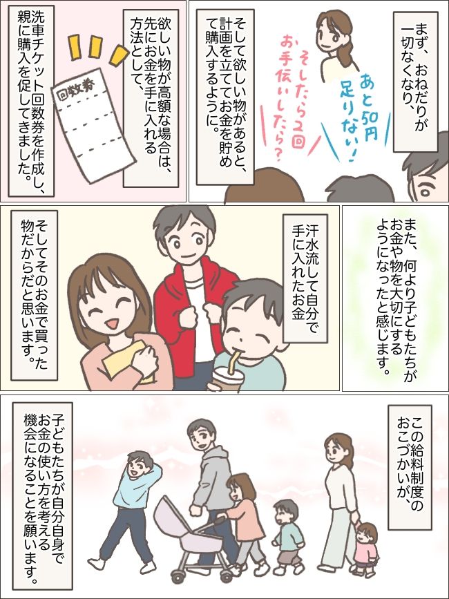 大家族だから我慢させるのは仕方がないとすませたくなくて、また「買いたい物を自分で選んで買う」という経験をしてほしくて始めたおこづかいの給料制度。せっかくだから、メリハリがあるお金の使い方を子どもたちと一緒に考えたいと思っています。この給料制度のおこづかいが、子どもたちが自分自身でお金の使い方を考える機会になることを願っています。