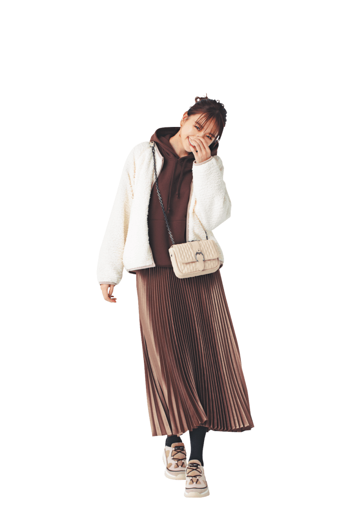 万能な膝上丈でパンツとも合わせやすい。ブラウンパイピングとスキニーでボアの甘さを軽減。