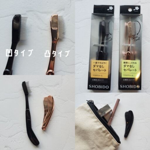 目の形に沿ってカーブする凹タイプは、初心者でも使いやすい設計。また、反対にカーブが出ている凸タイプは、人によってまつげの長さや形の違いがあっても細かい調整がしやすい設計となっています。どちらも金属製のコームなので一度できれいにダマをとりきることができますし、折り畳めてポーチに入れて持ち運びやすいのもおすすめポイントです。