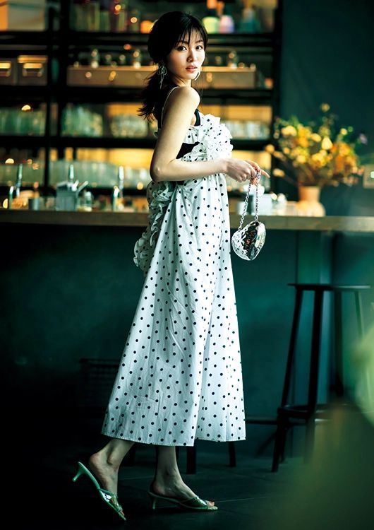 フリルたっぷりな胸元の、小悪魔っぽい雰囲気がたまらない。背中が大胆に開いたデザインは、付属のアメスリタンクを合わせて、色気をセーブするのが上品です。